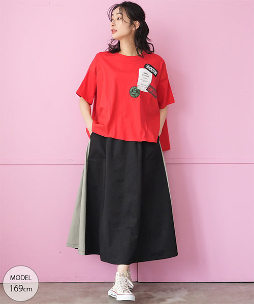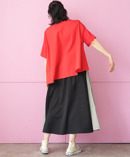 ロゴプリントのパッチワークが日常に映える、Aラインカットソーです。 斜め切り替えが裾に綺麗なドレープを描き、ラフ過ぎないリラックス感が味わえます。 ボディラインを拾わず、大人に効く着やせ服です。 普通のTシャツにはないニュアンスで差をつける技ありアイテムです。