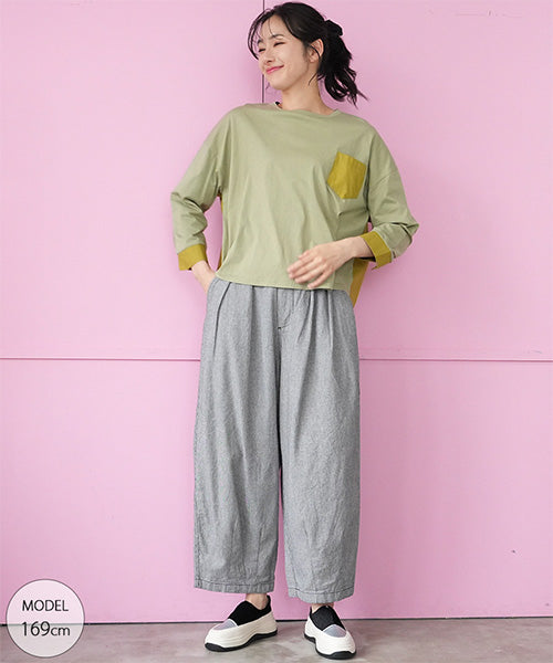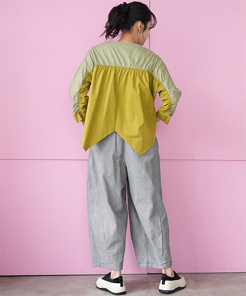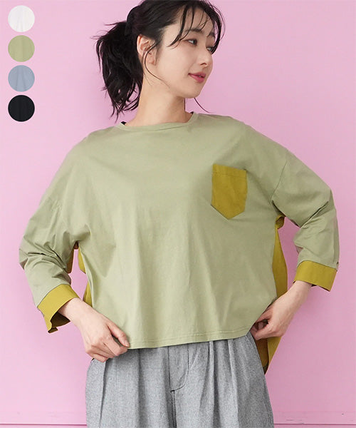異素材・バイカラー切り替えの遊び心が胸躍る、ショート丈カットソーです。後ろ身頃から袖にかけてゴムを通し、動きやすさとデザイン性を高めました。左胸のパッチポケットも良いアクセントになっています。ストレスフリーのオーバーサイズで、こなれたカジュアルを演出しています。