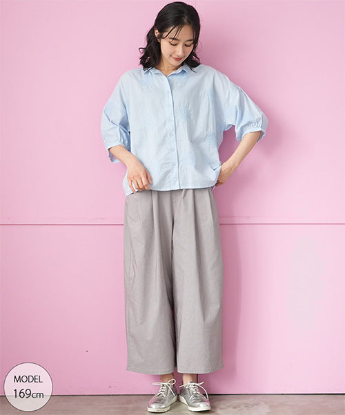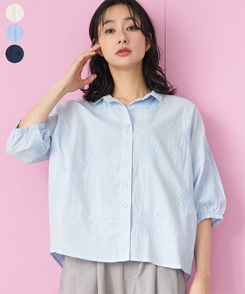 綿100%サークル刺繍6分袖オーバーサイズブラウス 33-0501