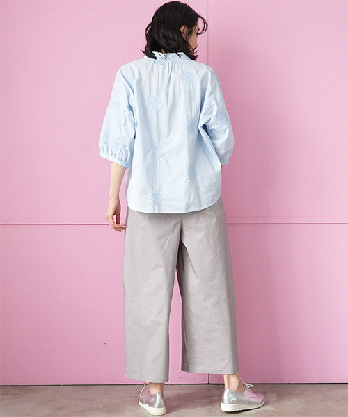ネックまわりや袖口にギャザーを寄せて、大人可愛く仕上げたシュート丈のブラウスです。 フワフワしたボールのような刺繍が、優しい印象になっています。 オーバーサイズなので衿は小さめにし、着膨れ感が出ないようメリハリを付けました。 薄手綿で軽いため、ワンピースやタンクトップ等の羽織としてコーデしても良いと思います。