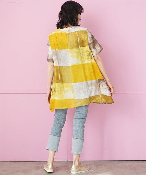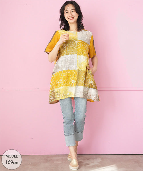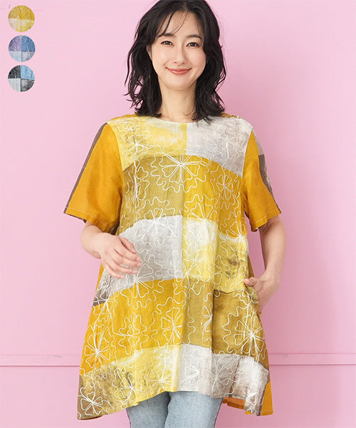 綿100%ムラ染め風プリント半袖コード刺繍チュニック 33-0504